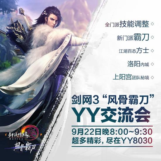 YY8030今晚等你来9月22日晚8点登陆YY8030参与策划交流会,剑网3制作人郭炜炜携技能策划为你揭秘霸刀武学!并带来新门派、技能调整、新玩法、新副本、新剧情等超多爆料!7点半提前到场参与活动更有机会获得夜幕星河、测试服激活码等奖励,万勿错过哦!