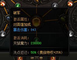 破军。激活属性:对英雄加成——暴击伤害:843。激活消耗:天赋魔力:230000。洗点返还:50%(贵族特权+25%)。