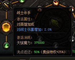 战士杀手。激活属性:对英雄加成——对战士伤害增加:2.0%。激活消耗:天赋魔力:375000。洗点返还:50%(贵族特权+25%)。
