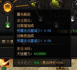 暴伤抵抗。激活属性:对英雄加成——受暴击伤害减少:4.0%,对角色加成——受暴击伤害减少:4.0%。激活消耗:天赋魔力:4120000。洗点返还:50%(贵族特权+25%)。