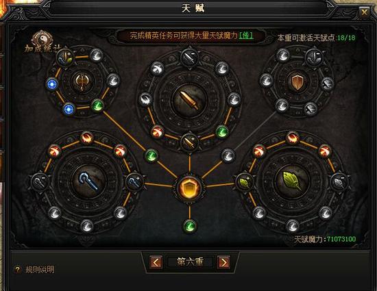 第六重可激活天赋点多达18点,但相对的,可选的天赋点也一下子变成了许多。这就对新手玩家造成了困扰。完成精英任务可获得大量的天赋魔力。注意这些配点是可以取消重配的。但是中间点不能随意撤销,需要把支线上的所有配点都清除之后才能取消掉。但是洗点有个不足的地方,那就是只能返还天赋魔力50%,皇冠贵族好一点,是75%。所以一旦配好点,最好不要重洗。