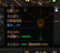 狂暴之力。激活属性:对英雄加成——暴击:145。激活消耗:天赋魔力:690000,洗点返还:50%(贵族特权+25%)。