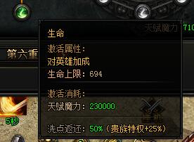 生命。激活属性:对英雄加成——生命上限:694。激活消耗:天赋魔力:230000。洗点返还:50%(贵族特权+25%)。