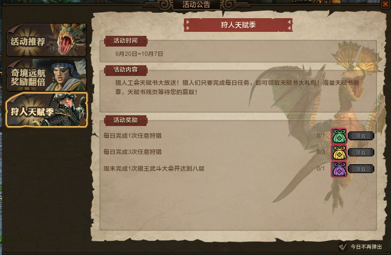 猎人公会天赋书大放送!活动期间,猎人们只需要完成活动指定的每日任务,即可在游戏内活动版面处领取天赋书大礼包!海量天赋书断章、天赋书残页等你来拿!