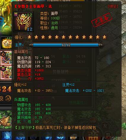 强化+12——魔法攻击:+(0-395),注灵+12——魔法攻击:+(202-102)。