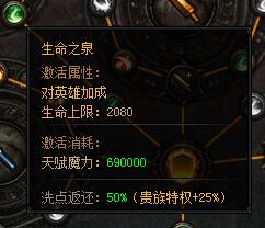 生命之泉。激活属性:对英雄加成——生命上限:2080。激活消耗:天赋魔力:690000。洗点返还:50%(贵族特权+25%)。