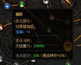 鹰眼。激活属性:对英雄加成——准确:74。激活消耗:天赋魔力:230000。洗点返还:50%(贵族特权+25%)。