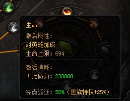 生命。激活属性:对英雄加成——生命上限:694。激活消耗:天赋魔力:230000,洗点返还:50%(贵族特权+25%)。