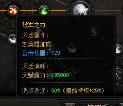 破军之力。激活属性:对英雄加成,暴击伤害:729,激活消耗:天赋魔力:195000。洗点返还:50%(贵族特权+25%)。