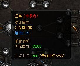 狂暴。激活属性:对英雄加成:暴击:29,激活消耗:天赋魔力:65000,洗点返还:50%(贵族特权+25%)。