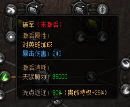 破军。激活属性:对英雄加成:暴击伤害:243,激活消耗:天赋魔力:65000,洗点返还:50%(贵族特权+25%)。