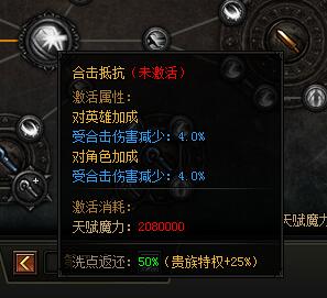 合击抵抗。激活属性:对英雄加成:受合击伤害减少:4.0%,对角色加成:受合击伤害减少:4.0%,激活消耗:天赋魔力:208000,洗点返还:50%(贵族特权+25%)。