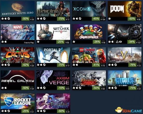 《毁灭战士4》半价促销,现卖99元,《幽浮2》现在104元,《巫师3》95元,《神界:原罪2》56元,《城市:天际线》22元,《文明5》23元。