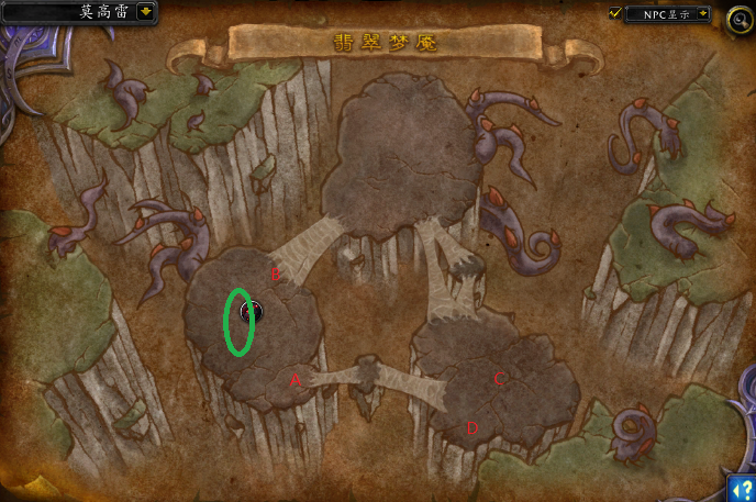 A点起手,BOSS升空后,召唤小蜘蛛,一个坦克拉住小蜘蛛到绿圈处击杀,另外一个坦克拉BOSS至B点,一般跑两次进入P2。