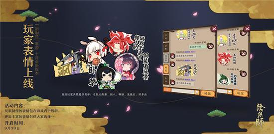 9月30日维护后,五名玩家老鼠夫斯基、啊缺、鬼使白、田八、好多虫自制的优质《阴阳师》表情包将在游戏内同步上线,萌化你的聊天频道!