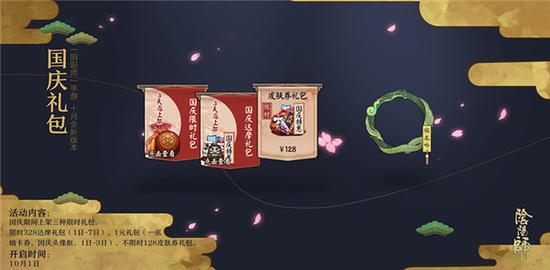 10月1日至10月7日,商店即将上架特惠328元达摩礼包、128元皮肤券礼包,1日至3日更有每日上架超值国庆限时礼包,内含神秘的符咒*1和国庆头像框*1。国庆期间,10月1日至10月7日,每天完成全部每日任务还可获得一张神秘的符咒,每日任务,连抽不停!