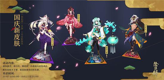 10月1日至10月7日,酒吞、青行灯、桃花妖、白狼正式加入皮肤商店,同时打折上架!商店原有皮肤不下架,更有之前出售皮肤上架回归,更多选择,任君抱走!