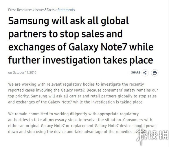 三星表示,我们正在和美国消费品安全委员会(CPSC)合作,调查最近报告的涉及Galaxy Note7爆炸起火的案件。由于消费者的安全仍然是我们的首要任务,三星将要求全球运营商和零售合作伙伴停止销售Galaxy Note7,目前调查正在进行。同时Note7用户应该关机,停止使用,包括持原装手机或已完成更换的用户。