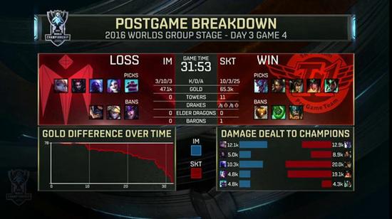 Faker中单霸主地位依旧>IM是一直非常善于打逆风的战队,但是面对拿到优势的SKT,IM确实没有太多办法。SKT在手握优势时并没有选择快速推进,而是在最大程度上压缩IM的地图资源,不断将雪球滚大。虽然没有出现太多击杀,但是SKT在20分钟时就已经将经济优势悄无声息的扩大到了8K之多。IM瑞兹虽然发育出色,但无奈很难有团战输出空间。在SKT攻上高地的一波团战中,IM站位分散,被SKT几乎用秒杀的方式击倒4人,IM也以较大差距输掉比赛。但对于这一支世界赛场的新军来说,输给SKT,是一个学习过程,也的确在意料之中。