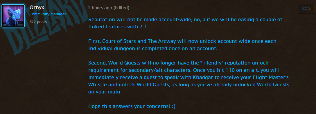声望将不会账号通用,但是我们会在7.1补丁中让一些相关内容变得更为容易。