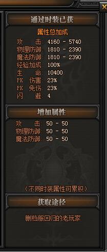 属性总加成:攻击:4160-5740,物理防御:1810-2390,魔法防御:1810-2390,经验加成:100%,生命:10400,PK伤害:23%,PK免伤:23%,闪避:4。