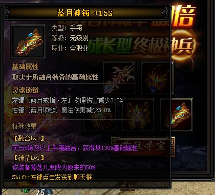 基础属性——取决于所融合装备的基础属性。灵魂项链——左戒:[蓝月戒指·左]物理伤害减少3.0%,右戒:[蓝月项链]魔法伤害减少3.0%。