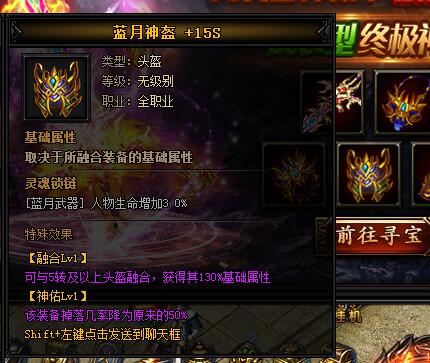 蓝月神盔+15S。类型:头盔,等级:无级别,职业:全职业。