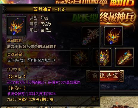 基础属性——取决于所融合装备的基础属性。灵魂项链——[蓝月头盔]闪避概率增加2.0%。