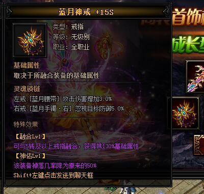 蓝月神戒+15S。类型:戒指,等级:无级别,职业:全职业。