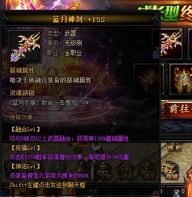 蓝月神剑+15S。类型:武器,等级:无级别,职业:全职业。