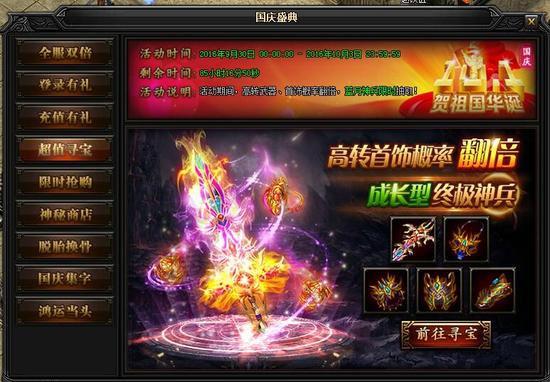 在2016年国庆节到来之际,XY游戏《蓝月传奇》游戏推出了一系列的国庆活动。其中备受瞩目的活动有七天登录有礼、超值寻宝、充值有礼、国庆集字、鸿运当头、脱胎换骨以及限时抢购,下面小编就会一一带领大家来了解这些国庆活动,怎么样更快获得,怎么样能够拿全活动奖励,都在下文攻略内容当中,高手玩家切勿错过!