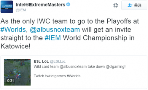 “由于ANX是在S6世界赛中唯一一支晋级淘汰赛阶段的队伍,所以我们将邀请ANX战队参加在卡托维兹的IEM11总决赛。”