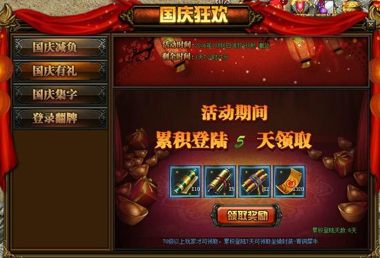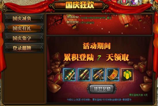 国庆有礼可以领取七天的活动奖励,前四天没什么可说的,重点在第五、第六和第七天上,这三天领取的奖励都是非常丰厚的,下面我们就一起来看看吧。