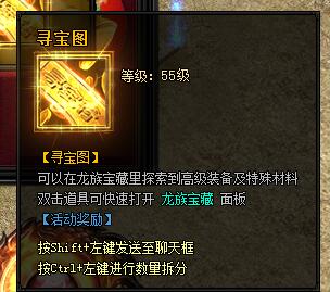 寻宝图。等级:55级。[寻宝图]可以在龙族宝藏里探索到高级装备及特殊材料。双击道具可快速打开龙族宝藏面板。[活动奖励]