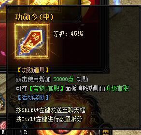 功勋令(中)。等级:45级。功勋道具。双击使用增加50000点功勋。可在[宝物-官职]面板消耗功勋值升级官职。[活动奖励]