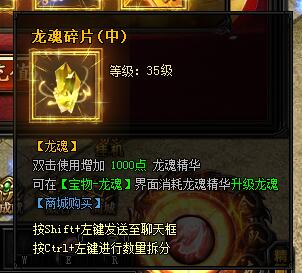 龙魂碎片(中)。等级:35级,[龙魂]。双击使用增加1000点龙魂精华。可在[宝物-龙魂]界面消耗龙魂精华升级龙魂。[商城购买]