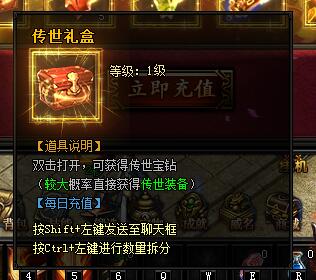 传世礼盒。等级:1级,双击打开,可获得传世宝钻(较大概率直接获得传世装备)[每日充值]