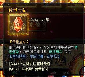 传世宝钻。等级:70级。[传世宝钻]用于进阶传世装备,可在盟众城神炉处兑换传世装备。双击可快速打开传世神兵界面。[商城限购、龙族宝藏、锁妖塔]。