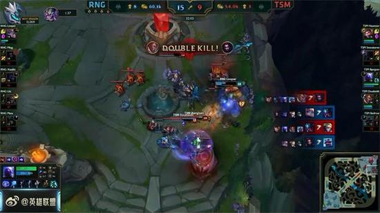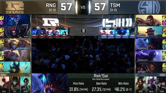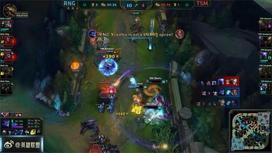 24分钟,下路龙王配合娜美抓死了杰斯,随后蜘蛛赶到闪现E到卢锡安,双方打,RNG连续击杀了三人,然而此时比尔森站了出来,瑞兹在背后疯狂输出,成功击杀了EZ和波比,拯救了TSM!果然瑞兹到了后期有些逆天啊!