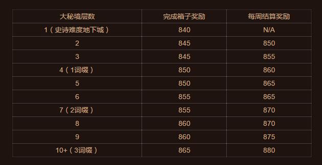 大秘境的装备奖励分为两个部分:分别是完成地下城后的箱子奖励和每周结算奖励,现将各层奖励装备的装等列出:
