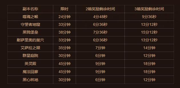之前,暴雪对大秘境的限时做了一轮在线修正,减少了艾萨拉之眼、噬魂之喉和耐萨里奥的巢穴三个副本的时间,使得这三个副本获取三箱奖励的难度增加,但是这三个副本仍然是冲击三箱奖励难度较低的副本。