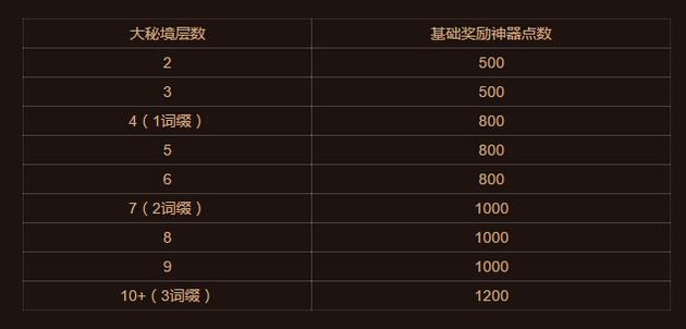 奖励的神器点数会随着层数的增加而增加,以下列出的均为未受到神器知识加成前的基础神器点数: