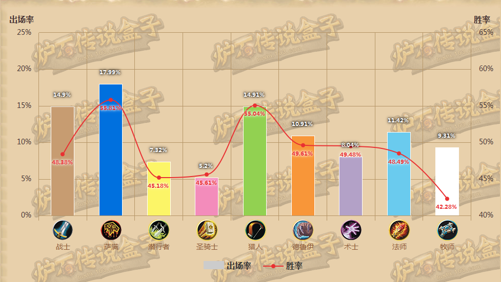 从出场率方面来看,上周萨满出场率高达17%,而在削弱之后,出场率跌倒12%从第一掉到第三,德鲁伊出场率从上周的10%上升到13.88%,超过萨满。而战士保持与上周相近的出场率15%居于第一。