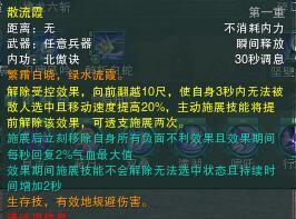 可移动读条伤害,读秘籍22尺距离,共4跳,伤害可观。点奇穴可以封轻功,不过会产生4sCD,并且和碎江天减疗冲突,小编目前更倾向于点减疗。