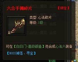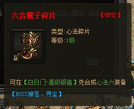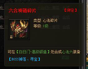 需要的六合项链碎片,主要是通过BOSS掉落、寻宝来加以获得。可在[白日门-高级锻造]处合成心法六装备。