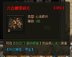 需要的六合腰带碎片,主要是通过BOSS掉落、寻宝来加以获得。可在[白日门-高级锻造]处合成心法六装备。