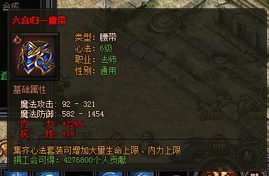 六和归一魔带。类型:腰带,心法:6级,职业:法师,性别:通用。基础属性——魔法攻击:92-321,魔法防御:582-1454,内力:+2265(特有),抗性:+18(特有)。集齐心法套装可增加大量生命上限、内力上限。捐工会可得:4276800个人贡献。
