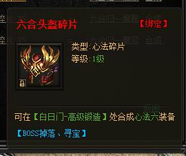 需要的六合头盔碎片,主要是通过BOSS掉落、寻宝来加以获得。可在[白日门-高级锻造]处合成心法六装备。