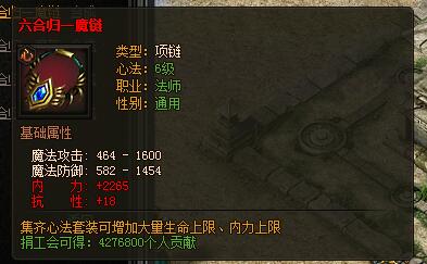 六合归一魔链。类型:项链,心法:6级,职业:法师,性别:通用。基础属性——魔法攻击:464-1600,魔法防御:582-1454,内力:+2265(特有),抗性:+18(特有)。集齐心法套装可增加大量生命上限、内力上限,捐工会可得:4276800个人贡献。