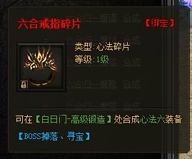 需要的六合戒指碎片,主要是通过BOSS掉落、寻宝来加以获得。可在[白日门-高级锻造]处合成心法六装备。